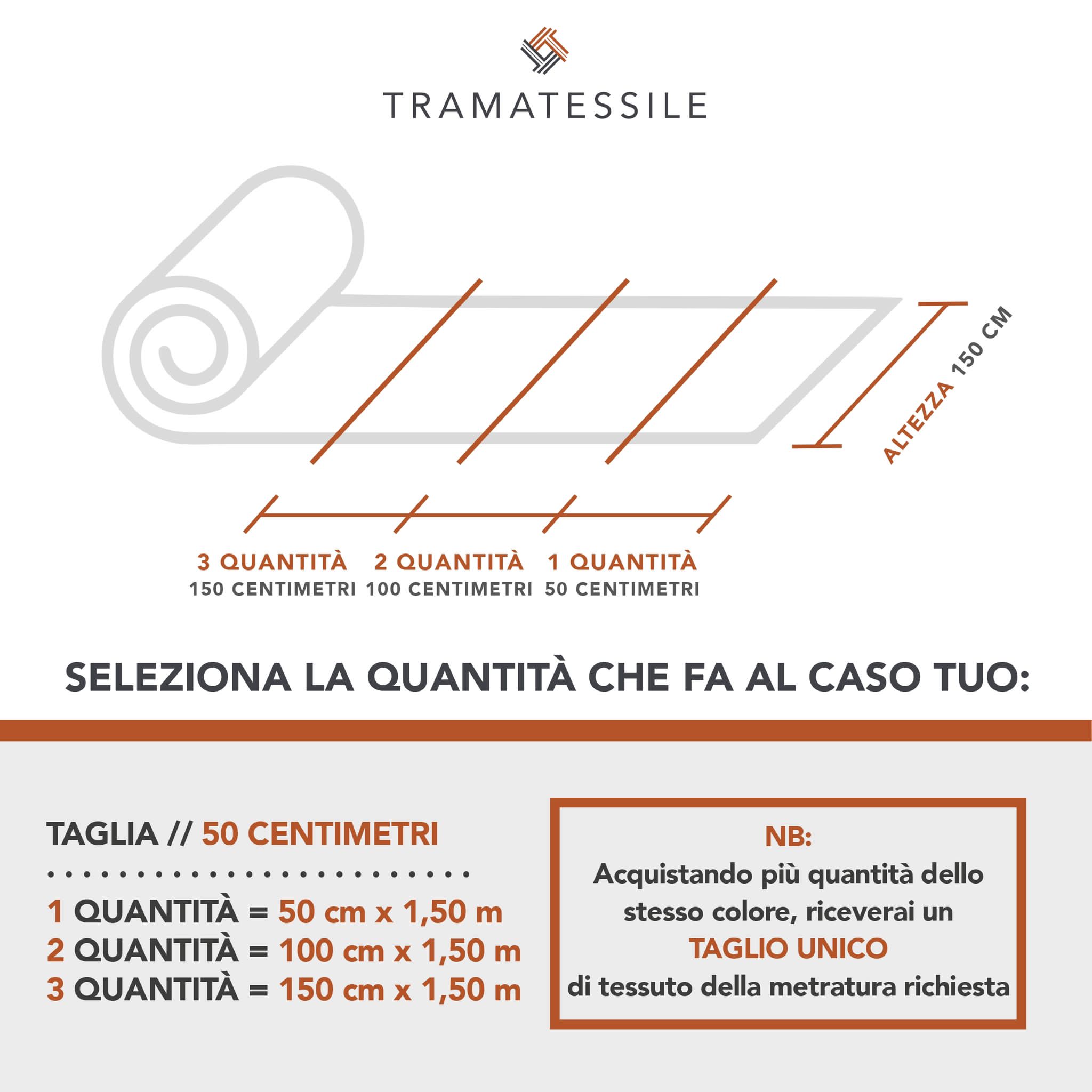 Scegli il colore e la lunghezza di tessuto (a partire da 0,50 m x 1,45 m) che ti occorre negli appositi box sottostanti.
