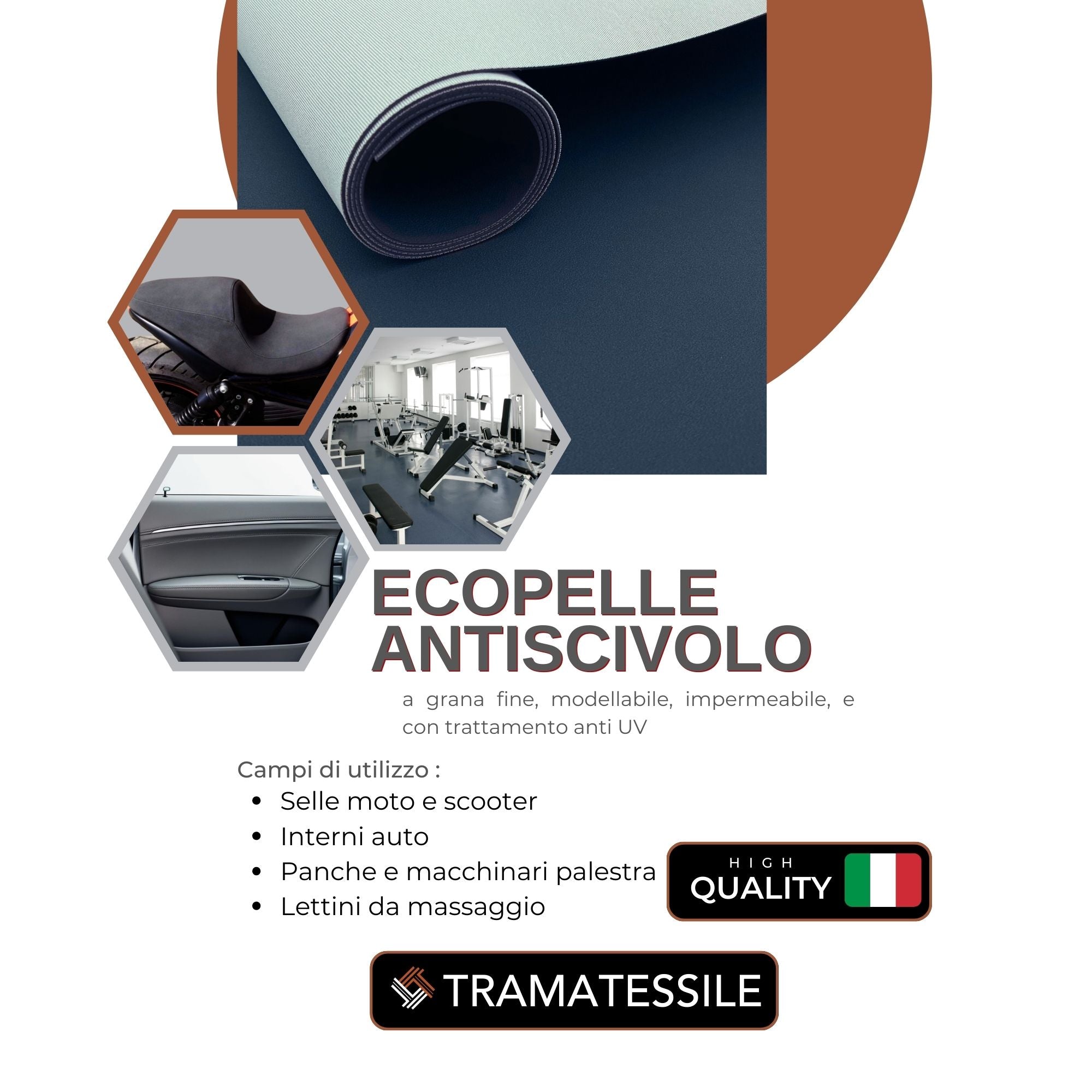Tessuto ecopelle antiscivolo elasticizzato a grana fine anti macchia, idrorepellente ed anti UV. Adatto nel campo dei rivestimenti auto e moto, per il rifacimento di sedili auto, selle, di cruscotto e pannello portiera. Date le elevate caratteristiche tecniche è ideale anche per il rivestimento di imbottiti sia per interno che per esterno.